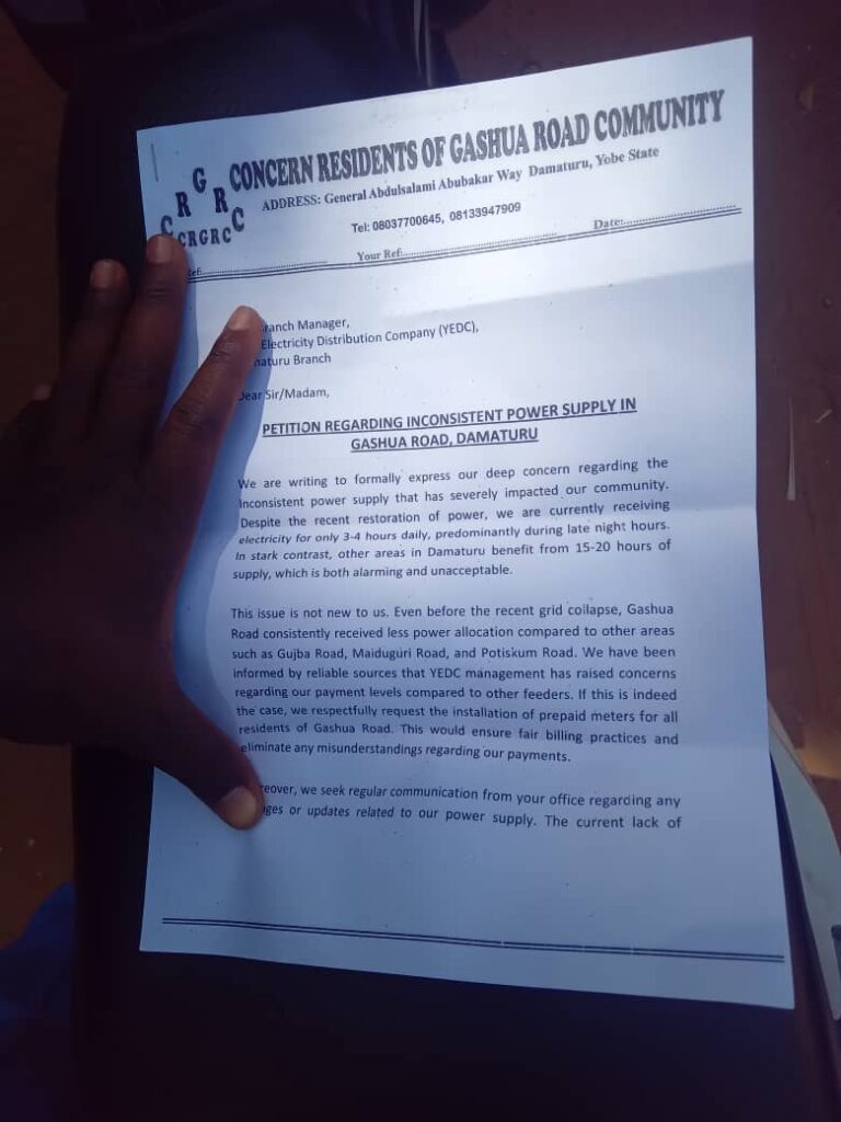 Residents of Gashua Road in Damaturu are raising urgent concerns regarding inconsistent power supply, receiving electricity for only 3-4 hours daily, primarily during late night hours. This stark contrast to other areas, which enjoy 15-20 hours of service, has led the community to formally petition the Yola Electricity Distribution Company (YEDC) for prepaid meters to ensure fair billing.